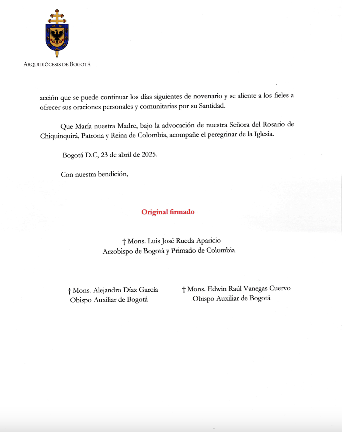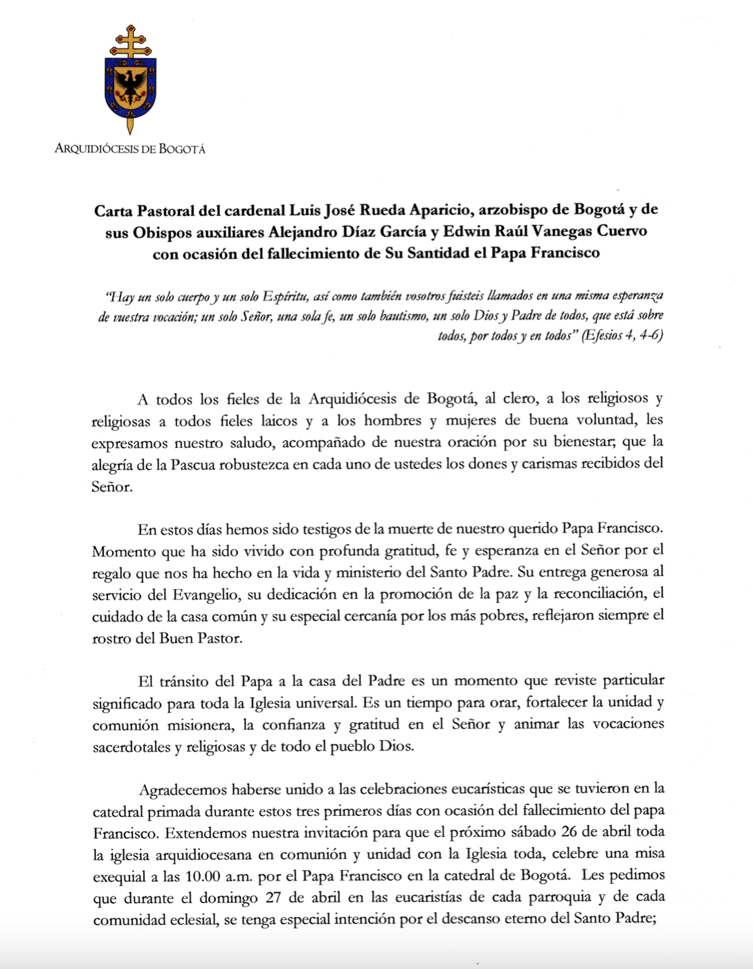 Carta Pastoral del cardenal Luis José Rueda Aparicio, arzobispo de Bogotá y de sus obispos auxiliares con ocasión del fallecimiento de Su Santidad el Papa Francisco