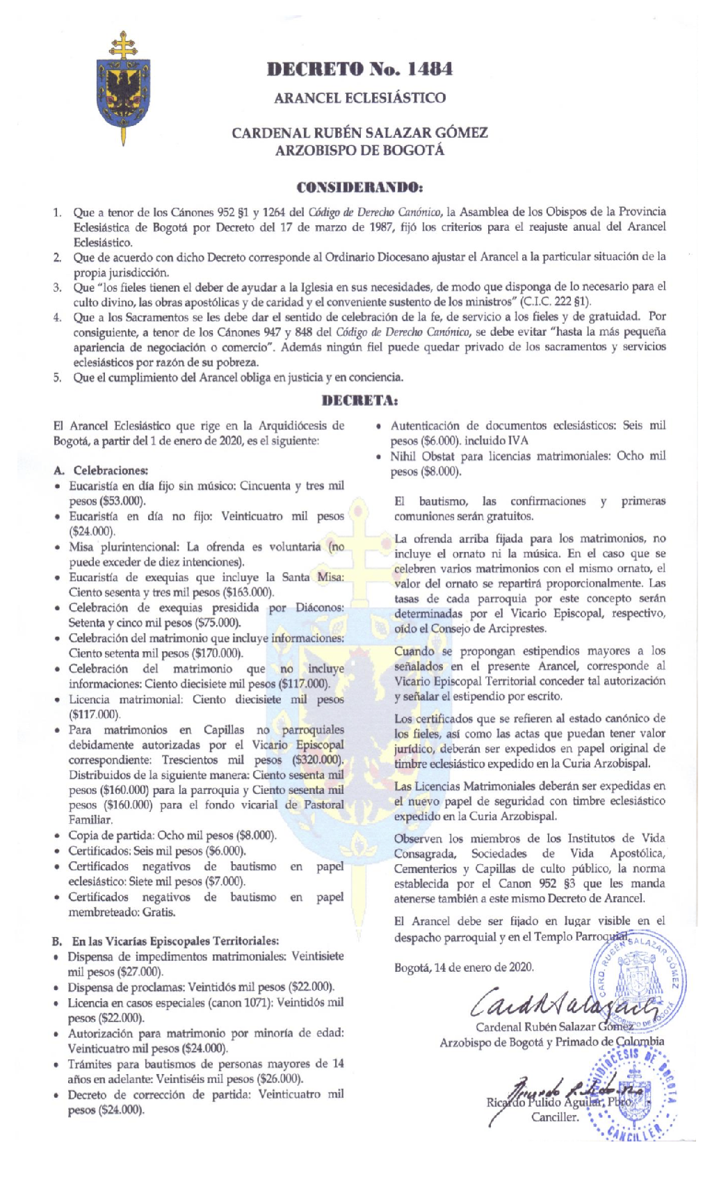 Centro de información Yo quiero Noticias Boletines Eventos Artículos Canonización Mensajes del Señor Cardenal Cartas pastorales Homilías Mensajes La voz del pastor Documentos del Vaticano BoletinesDecreto del Arancel Eclesiástico para el año 2020 20 de Enero de 2020 El señor canciller, padre Ricardo Pulido, ha dispuesto la publicación del decreto de arancel para este año Like 4 Dislike 1 Últimos boletines Nombramientos en la Arquidiócesis de Bogotá20 de Noviembre de 2025La cancillería arquidiocesana comunica los siguientes nombramientos: La señora María Rivera descansa en la Casa del Padre 12 de Noviembre de 2025Elevamos plegarias al Señor de la vida como Iglesia arquidiocesana por la señora María y oramos para que el Padre la acoja en su Reino