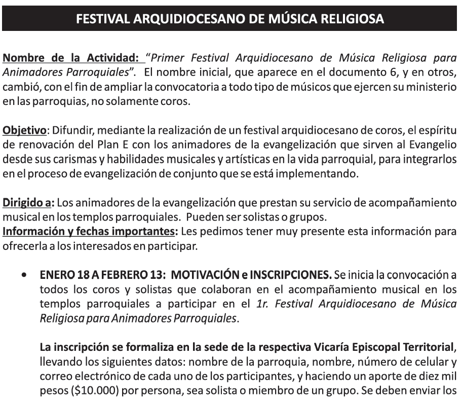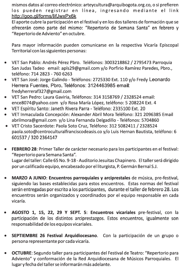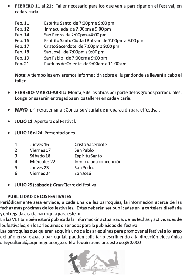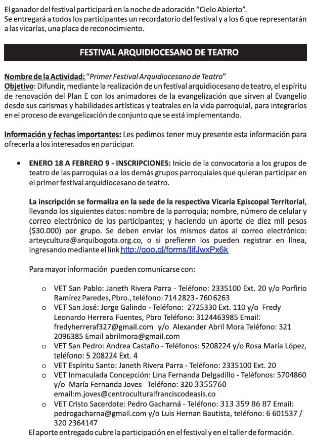 Centro de información Yo quiero Noticias Boletines Eventos Artículos Canonización Mensajes del Señor Cardenal Cartas pastorales Homilías Mensajes La voz del pastor Documentos del Vaticano NoticiasFestivales arquidiocesanos de música religiosa y de teatro16 de Febrero de 2015A continuación se presenta una información básica acerca de los festivales arquidiocesanos de música y teatro, programados como actividades complementarias del Gran Giro… Like 0 Dislike 0 Noticias relacionadas Ordenaciones en la Catedral Primada de Colombia Tiempo de preparación para la Navidad Video del papa - noviembre de 2025