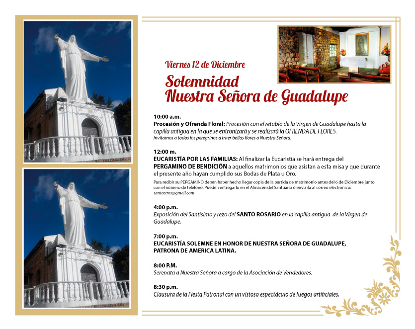 Centro de información Yo quiero Noticias Boletines Eventos Artículos Canonización Mensajes del Señor Cardenal Cartas pastorales Homilías Mensajes La voz del pastor Documentos del Vaticano NoticiasFiesta Patronal de Nuestra Señora de Guadalupe12 de Diciembre de 2014 Like 0 Dislike 0 Noticias relacionadas Ordenaciones en la Catedral Primada de Colombia Tiempo de preparación para la Navidad Video del papa - noviembre de 2025
