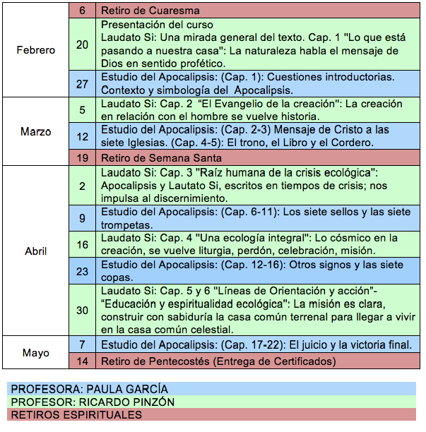 Paso a paso se desarrollará el estudio del Libro del Apocalipsis en cinco bloques lógicos que nos ayudarán a comprender y aplicar lo aprendido, alternado con cinco encuentros prácticos de la Encíclica Laudato Si del Papa Francisco: