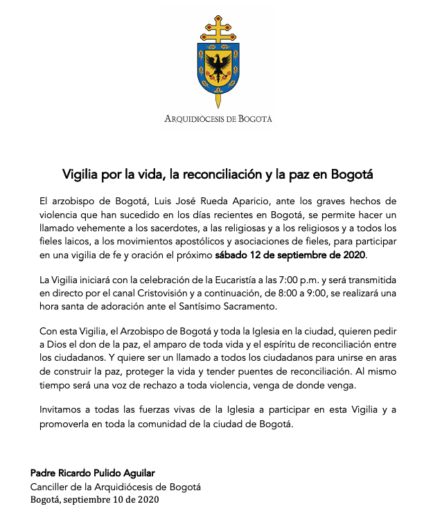 Centro de información Yo quiero Noticias Oraciones Boletines Eventos Artículos Canonización Mensajes del Señor Cardenal Cartas pastorales Homilías Mensajes La voz del pastor Documentos del Vaticano NoticiasVigilia por la vida, la reconciliación y la paz en Bogotá12 de Septiembre de 2020 Like 0 Dislike 0 Noticias relacionadas Ordenaciones en la Catedral Primada de Colombia Tiempo de preparación para la Navidad Video del papa - noviembre de 2025